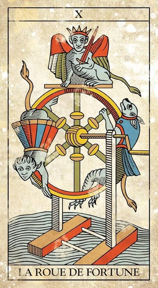 The wheel turning in the constant flux of these downward tendencies, best understood as “chaotic” or “centrifugal” forces, and upward tendencies, best understood as “order” and “centripetal” forces, is symbolic of the great drama of cosmic manifestation with respect to divine law. It should be noted that this Major Arcana of the Wheel of Fortune is the 10th, with 10 being the sum of all the divine years of the four cosmic cycles added together, and 10 being symbolic of temporal order (see again our The Esoteric and Cosmological Significance of Four). We will also note in passing the “Fortune” understood here should be identified as “Necessity” which extends from the Providence of God’s Divine Plan, since that which is natural is, by convention, necessary.